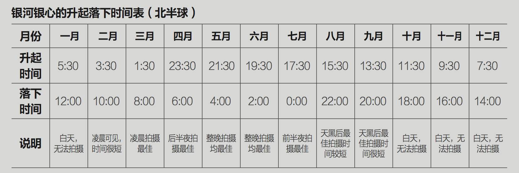 - 1. 每年的1月、10-12月这4个月,银心升起落下时间都在白天,拍不到银心,但银河的其余部分还是可以拍到的。
