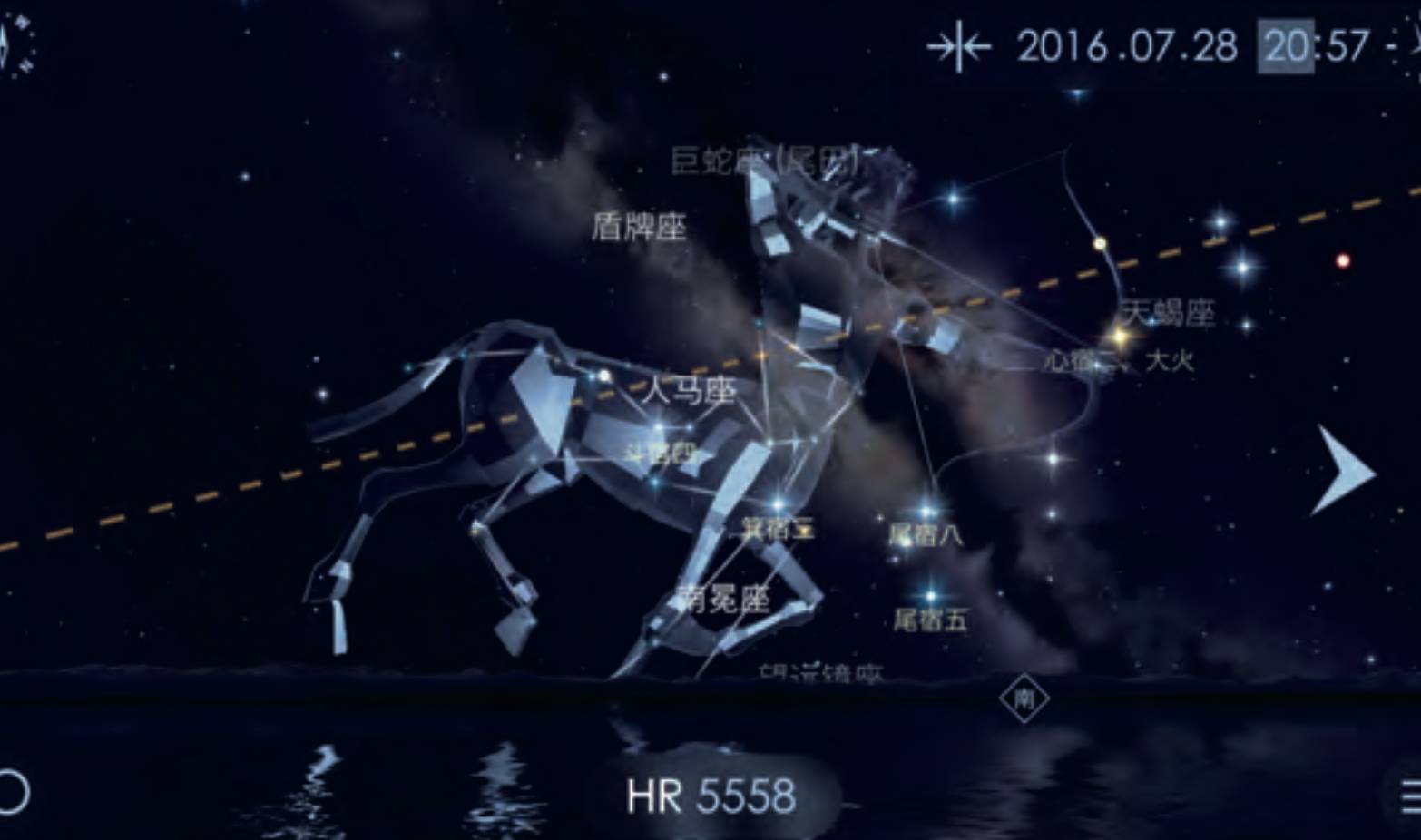 以StarWalk 2为例,该软件能够模拟整个夜空的实时运行 情况,实时定位天体的位置,且 画面精美,资料详细,作为天文 教育、野外观测、拍摄来说有着绝对强悍的辅助作用。我们在拍摄时,打开该软件,将手机对向夜空,并配合手机内置的陀螺仪,精准定位银河的位置,十分便捷。